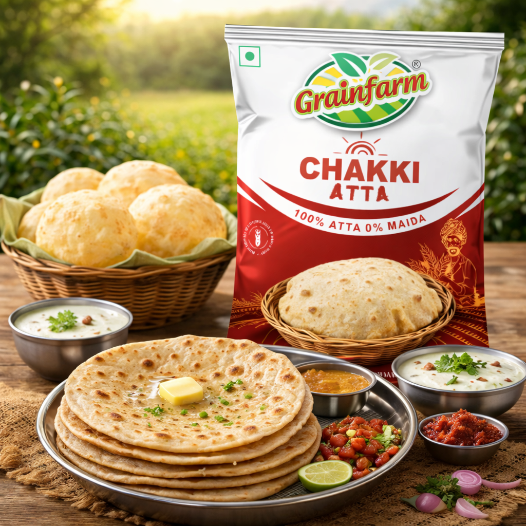 Grainfarm Chakki Atta is made from 100% whole wheat, traditionally stone-ground to preserve the natural fibre, aroma, and taste of wheat. Carefully processed and hygienically packed, this atta delivers soft rotis, consistent texture, and wholesome nutrition for daily Indian cooking.